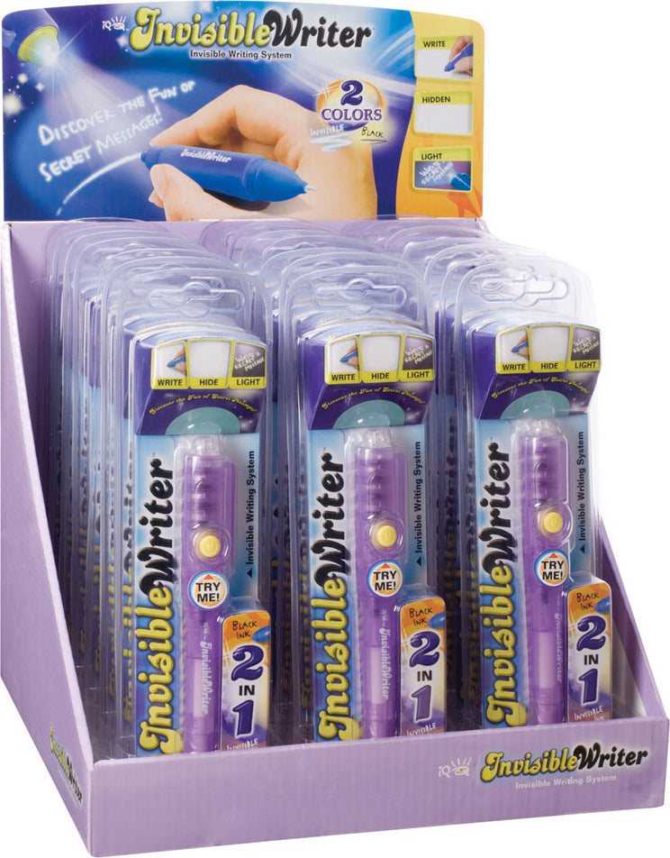 The 2-In-1 Invisible Writer Pen from Toysmith lets you write both invisible and normal ink messages. Each pen is a translucent purple with a black light in the cap. Press the yellow button to activate the light to read messages written in invisible ink. Each pen also includes either regular black or blue ink for everyday, visible writing use