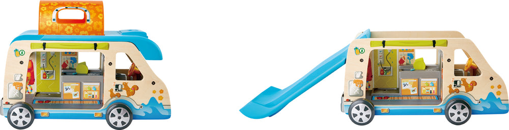 Head out for an amazing camping adventure with picnics, surfing and even hang-gliding with this brilliant, easy-to-carry camper van complete with dolls and accessories!
