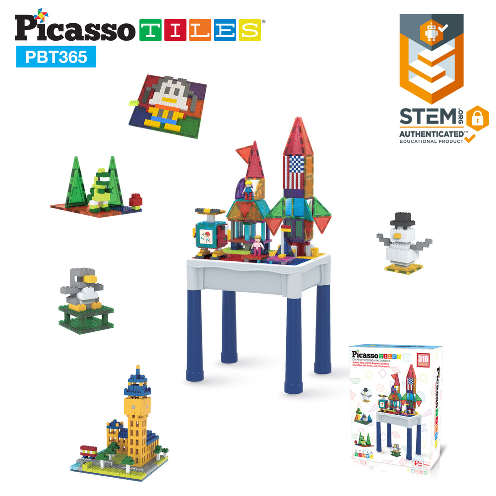 BRAND NEW DESIGNS: PicassoTiles has combined the world's best two beloved construction toys to another whole new level! The 316pcs magnetic brick tile building table set includes 1 multi-use kids table, 24 magnetic brick tiles, 32 magnetic tiles in different shapes, 1 click-in graphic, 4 magnetic mirror tiles, 2 magnetic action figures, and 250 small and big building bricks plus 2 brick separators for unlimited creations.