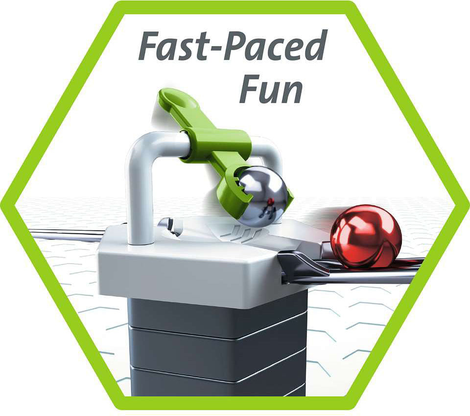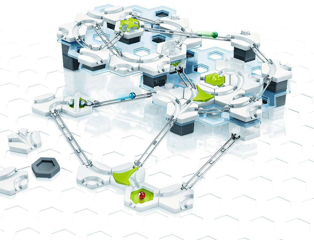 Experience the Power of Gravity with GraviTrax! With over 100 pieces and 18 different construction elements, the GraviTrax Starter Set offers everything you need to begin building your own action-packed track systems. Discover how the laws of physics affect the journey your marble takes with curves, junctions, freefalls and even a cannon. Experiment using different heights and angles to control the speed of the marble to get it to the finish. Contents: Instructions (D, F, EN, NL, E), construction plan booklet, task booklet, 4 base plates, 2 transparent levels, 6 balls, 40 large height tiles, 12 small height tiles, 21 curves, 3 junctions, 2 switches, 1 3-in-1 tile, 1 vortex, 1 launch pad, 1 magnetic cannon, 3 long tracks, 6 medium tracks, 9 short tracks, 1 finish line, 4 basic tiles, inserts for basic tiles: 2 catchers, 1 freefall, 1 splash, 1 landing Total Pieces: 122