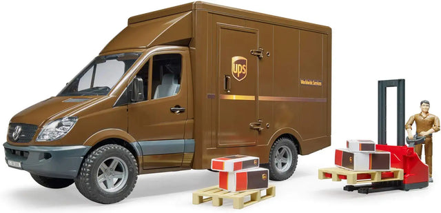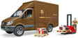 UPS, one of the world's leading shipping service providers, also relies on Sprinters as delivery vehicles. This vehicle dominates today's city streets and has now been added to the Bruder range. The vehicle features a two-part rear door that can be opened up to the limit stop on the body of the vehicle. Remove small items through the side door to save time. The vehicle's accessories include a manual pallet jack and two Euro pallets to load or unload heavy and/or bulky goods. This great set is rounded off by a UPS driver wearing the company's typical uniform. Typical UPS shipping boxes in different sizes are also included.
