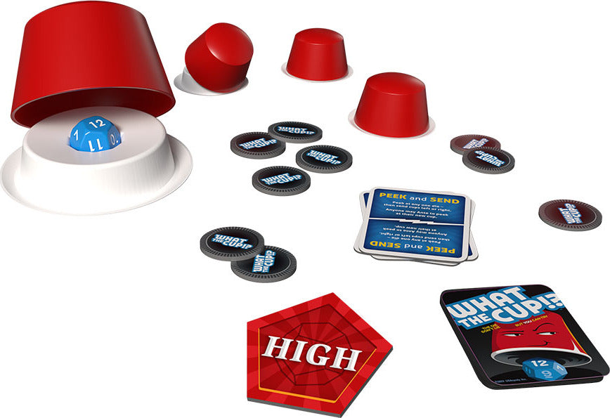 What The Cup!? is a game of luck and lies where you must do whatever it takes to end up with highest or lowest valued die. Sabotage your opponents by changing the winning target, or follow card directives to spy, swap, re-roll, or reveal dice. Bet your chips to raise the stakes and bluff your way to victory. Does your cup hold the winner? The die don't lie... but YOU can try!