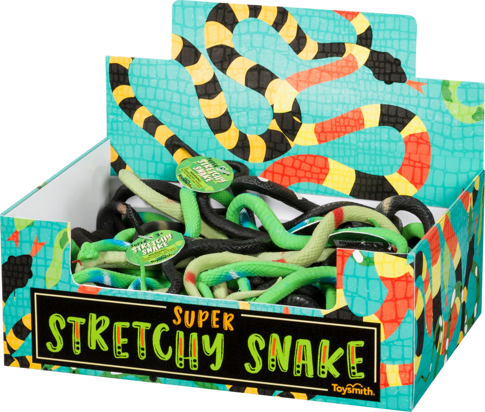 A smaller version of Toysmith’s popular Stretchy Snake toys, the Super Stretchy Snake comes in 4 assorted styles. Each 12-inch-long snake has a realistically textured body to provide an immersive play experience, a red forked tongue, and features either stripes or spots for markings. Colors vary but may include a mix of bright green, white, bright blue, black, pink, brown, light yellow, and red. Get an assortment of 52 packed inside a red and turquoise display box.