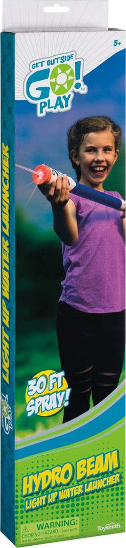 A unique water toy from Toysmith, the Hydro Beam Water Launcher has blue, orange, and white LED light-up action. Made of nontoxic and waterproof materials, this pump-action water blaster can shoot up to 30 feet. Super bright LED lights make every launched water jet look like a glowing laser. Press the button on the handle to activate the LED light. Best used outside, this water blaster is ideal for the beach, the pool, or to use in the backyard.