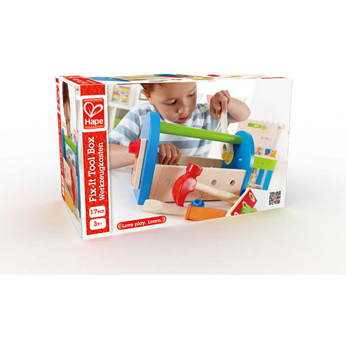 Hammer, tighten, measure, and screw with this fine Fix-It Toolbox from Hape. Your little fixer can take after Mom and Dad and engage in their own handy house projects with this ready-for-action toolbox with hammer, wrench, screwdriver, ruler and all the necessary building essentials. The Fix-It Toolbox and its tools are crafted with hallmark Hape high quality for a toy set that is built to last. For ages three years and up.