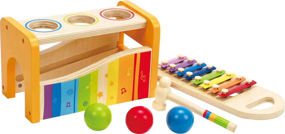 First steps into the world of music are easy with the Pound and Tap Bench. The colorful balls can be pounded through the holes with a hammer, playing out a little jingle as they bounce down the xylophone bars. When your little maestro feels like having more of a hand in music composition, the xylophone can be pulled out and little melodies can be played on its seven bars with the hammer. One of the hallmarks of Hape toys is their high-quality, durable construction, all showcased in the high-quality Birch, Maple, and child-safe finishings of the Pound and Tap Bench. For ages 12 months and up.