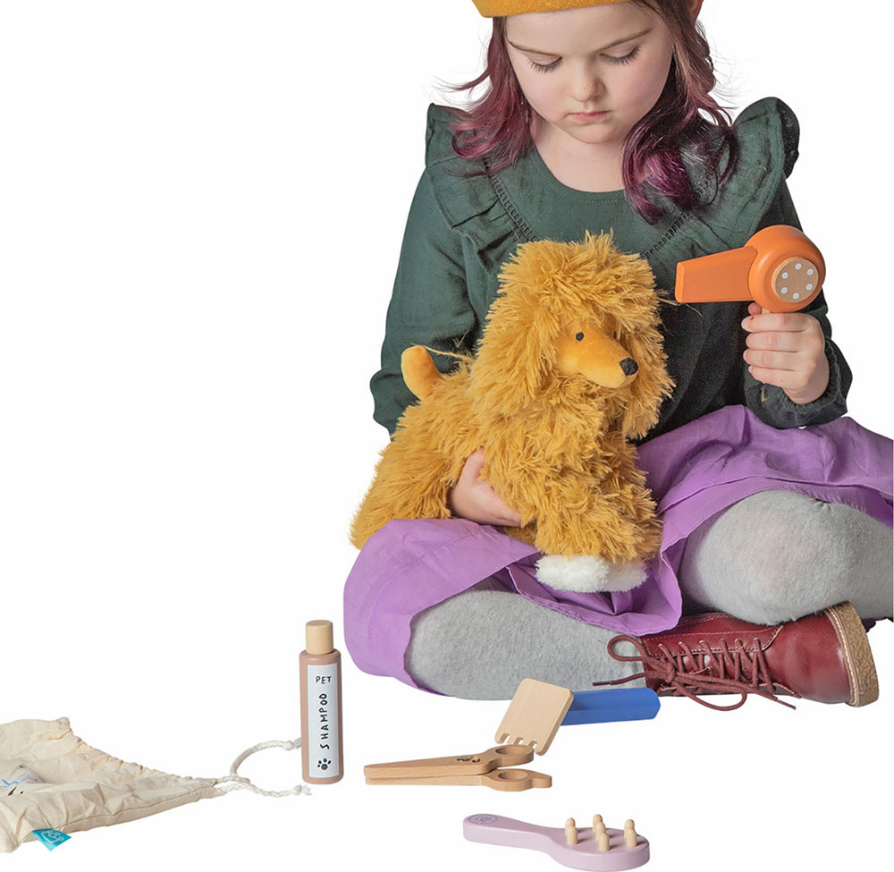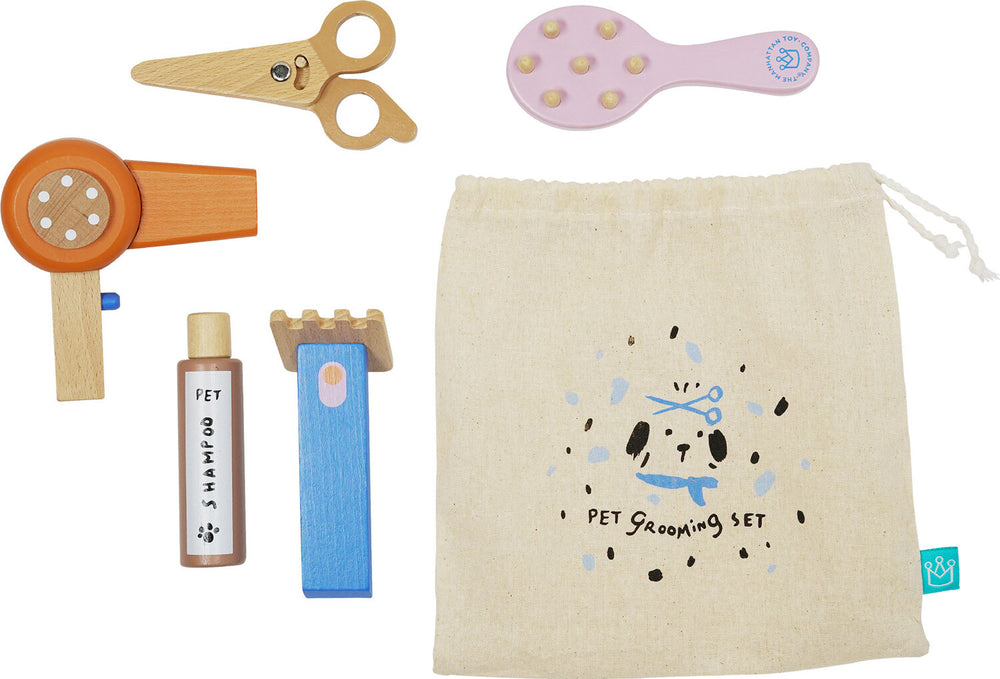 Pretend play just got better with to be the family pet or stuffed animal groomer can be quite fun with the Post Pet Day Spa Grooming Playset. Keep plush pals looking polished and looking good with the 6-piece pet grooming kit for kids. Accessorize other pretend vet clinic toys with Manhattan Toy's quality pet grooming toys; set includes - hairdryer, brush, pet shampoo, clippers, trimming sheers, and drawstring bag. Encourage motor development while building empathy through pet care play. When playtime's over, accessories store conveniently inside the muslin drawstring bag.