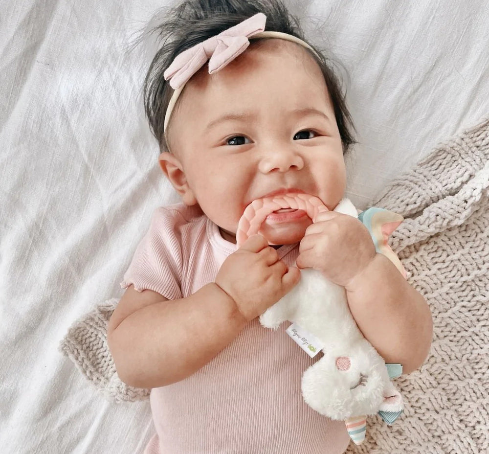The Ritzy Rattle Pal™ is your babe's new bestie, doubling as a plush rattle and braided teething toy to soothe sore gums. With a gentle rattle sound and colorful textured ribbons, this playful baby rattle keeps your little one entertained and comforted. Whether in the stroller or car seat, the Ritzy Rattle Pal makes a perfect travel toy! Choose from a variety of stuffed animal characters, including a unicorn, dinosaur, sloth, and koala, or the adorable rainbow option.