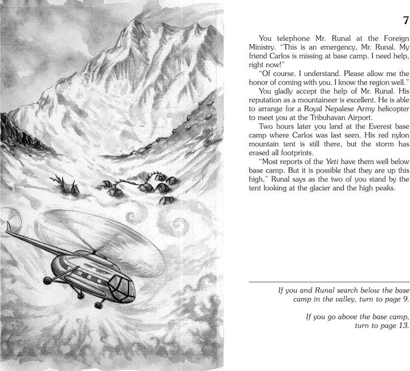 The Abominable Snowman by R. A. Montgomery takes YOU on a mountaineering adventure in search of the fabled Yeti, or Abominable Snowman! 9-12 year old readers will travel to Kathmandu and explore the Himalaya Mountains, negotiating harsh weather conditions, facing down a band of violent smugglers, following mysterious footprints in the snow, and maybe even finding the Yeti! Choose Your Own Adventure The Abominable Snowman is an interactive adventure book in which YOU decide what happens next. You and your best friend Carlos have traveled to Nepal in search of the Yeti. Carlos arrived three days before you and has not been heard from since. Do you search for him or strike out on your own? What do you make of the strange note he left for you? Could there be other dangers and other wonders in the high peaks of the Himalayas?
