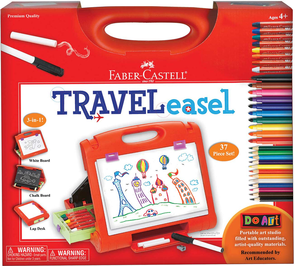-Filled with premium quality Faber-Castell materials -This portable art studio is the perfect gift for young artists -30+ piece set includes Faber-Castell beeswax crayons, markers, chalk, white wipe board marker, colored pencils, sharpener, sponge and sketch pad -Multi-functional surfaces include a chalkboard, a white wipe board and a drawing easel -Designed with storage in mind, all the materials fit neatly in it when not in use