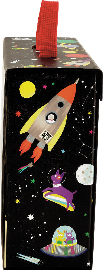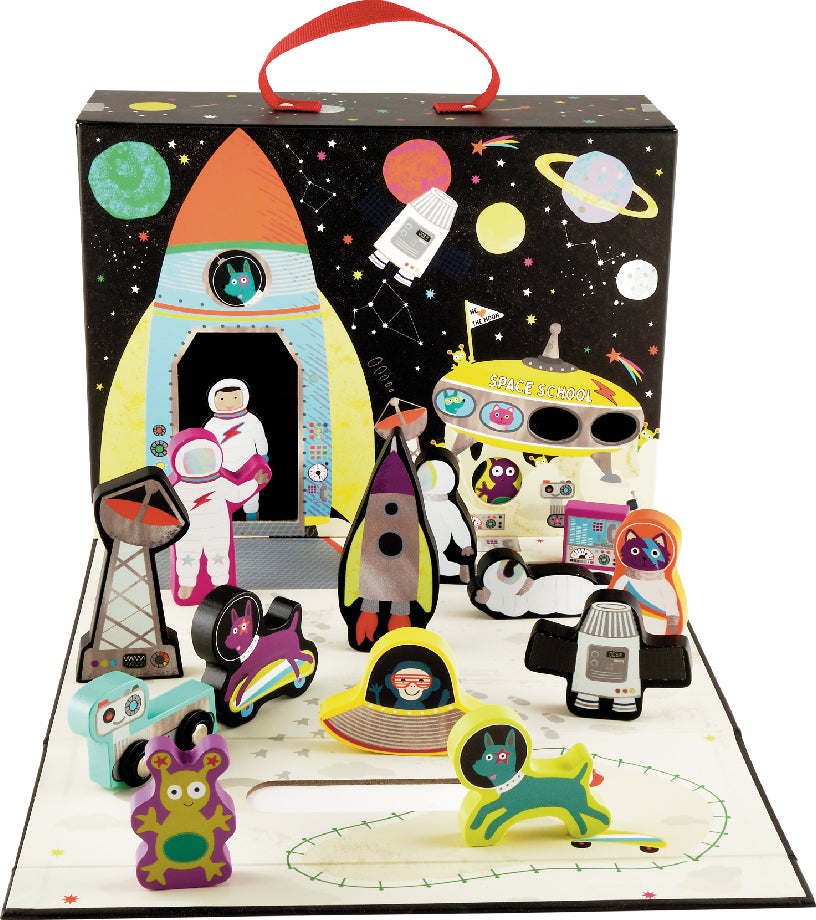 Which little person would not want a SPACE themed portable playbox? Our Space playbox comes complete with a cotton bag holding 15 fantastic, wooden, double sided pieces and characters. There are astronauts, rockets, aliens, flying saucers and more. Not to mention 2 brilliant pieces on wheels which can be joined together with magnets. With a fold down lid you can land on the moon or play inside the box which reveals the space station. There are little hide and seek windows for extra fun. It is fully portable with a cool carry handle should you want to take this to friends and it all stores away super quick! Enjoy hours of fun playing alone or with friends and siblings.