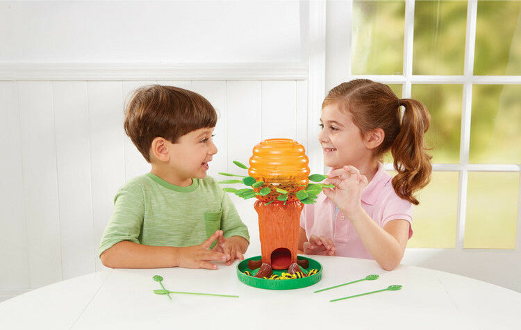 The Honey Bee Tree is an award winning game filled with suspense and excitement. Players must carefully remove leaves without dislodging the sleeping bees. The player with the fewest bees in their tray at the end of the game is the winner. When the tree is turned towards you, you must figure out which leaf to pull. The goal is to select the leaf that will wake the fewest bees and pull it out delicately to not disturb them. If you’re lucky none of them wake, and you turn the tree to the next person’s flower tray. The Honey Bee Tree is a favorite not only because it is a blast to play, but it also teaches children hand-eye coordination, strategic thinking, and dexterity. If they’re not thinking and acting carefully they’ll let all the bees out of the hive! Game play is essential to teaching children about working together, taking turns, and sharing. Bring children together and help them develop social and cognitively all while they’re having lots of fun with the Honey Bee Tree. Package contains (1) Game Zone Honey Bee Tree Game – Please Don’t Wake the Bees – 2 to 4 Players, Ages 3 and Up. Includes (1) honey pot, (1) old oak tree, (1) flower tray base, (32) leaves, (30) little honey bees, and (1) set of game rules.