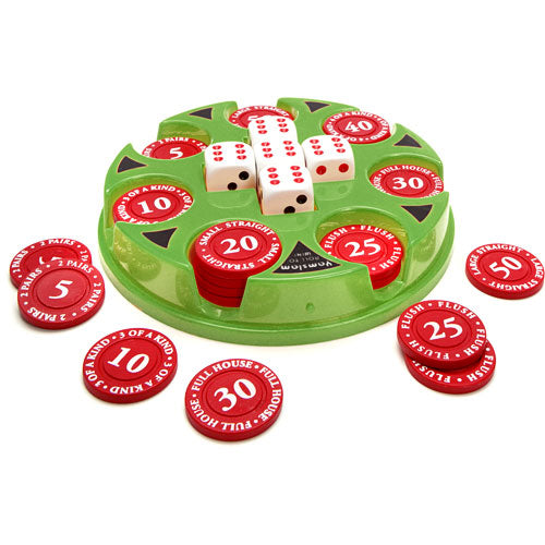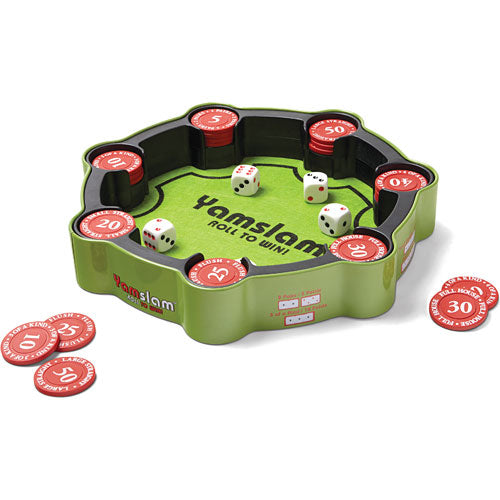 Yamslam is a fresh twist (with a BIG boost of fun) on popular dice games. With its interactive gameplay and attractive, self-contained design, this dice game offers so much more! No need for paper and pen—the scoring chips allow for non-stop action and easy point calculation. Let the five dice roll to achieve the best combination and win the corresponding chip. Players compete to grab the best chips before they run out and plan ahead for special bonuses.