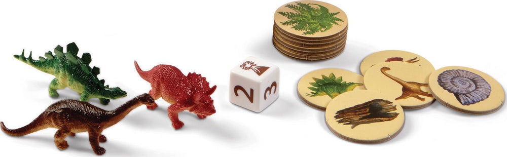 INCLUDES: 3 dinosaur movers, 1 die, 1 game board, 12 fern tokens and 5 volcano puzzle pieces with stand.