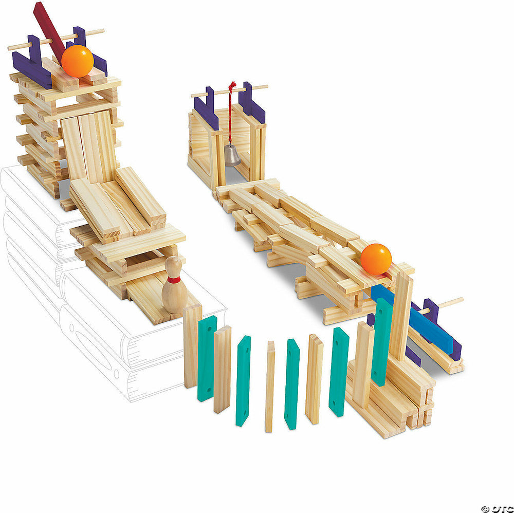 Includes: KEVA Contraptions Reactions contains 178 wooden planks, 8 dowels, 2 reaction balls, 1 bell, 1 string, 1 bowling pin, 1 toy car and a 16-page idea book with project photos and quick-start instructions.