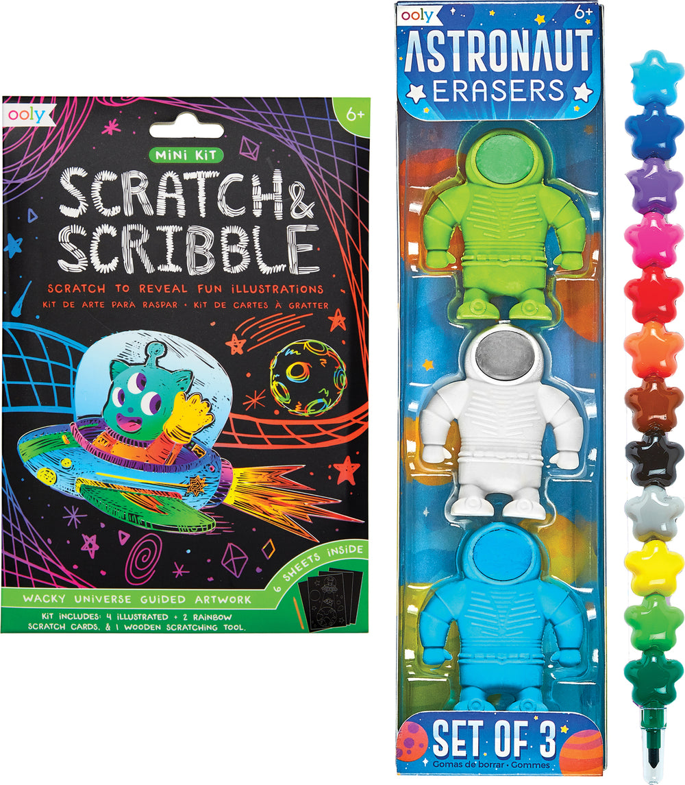 From a galaxy far far away, comes an out of this world space themed Happy Pack. This giftable activity pack comes with a set of 3 multi-colored astronaut erasers that blast mistakes off your page and into orbit. Star-shaped stackable crayons provide coloring fun in twelve shades to keep your little astronaut occupied while circling earth. And a set of funny, alien-themed scratch art cards. This giftable bundle comes in a zippered pouch, complete with gift tag, for super simple gifting, no matter what planet you're from.