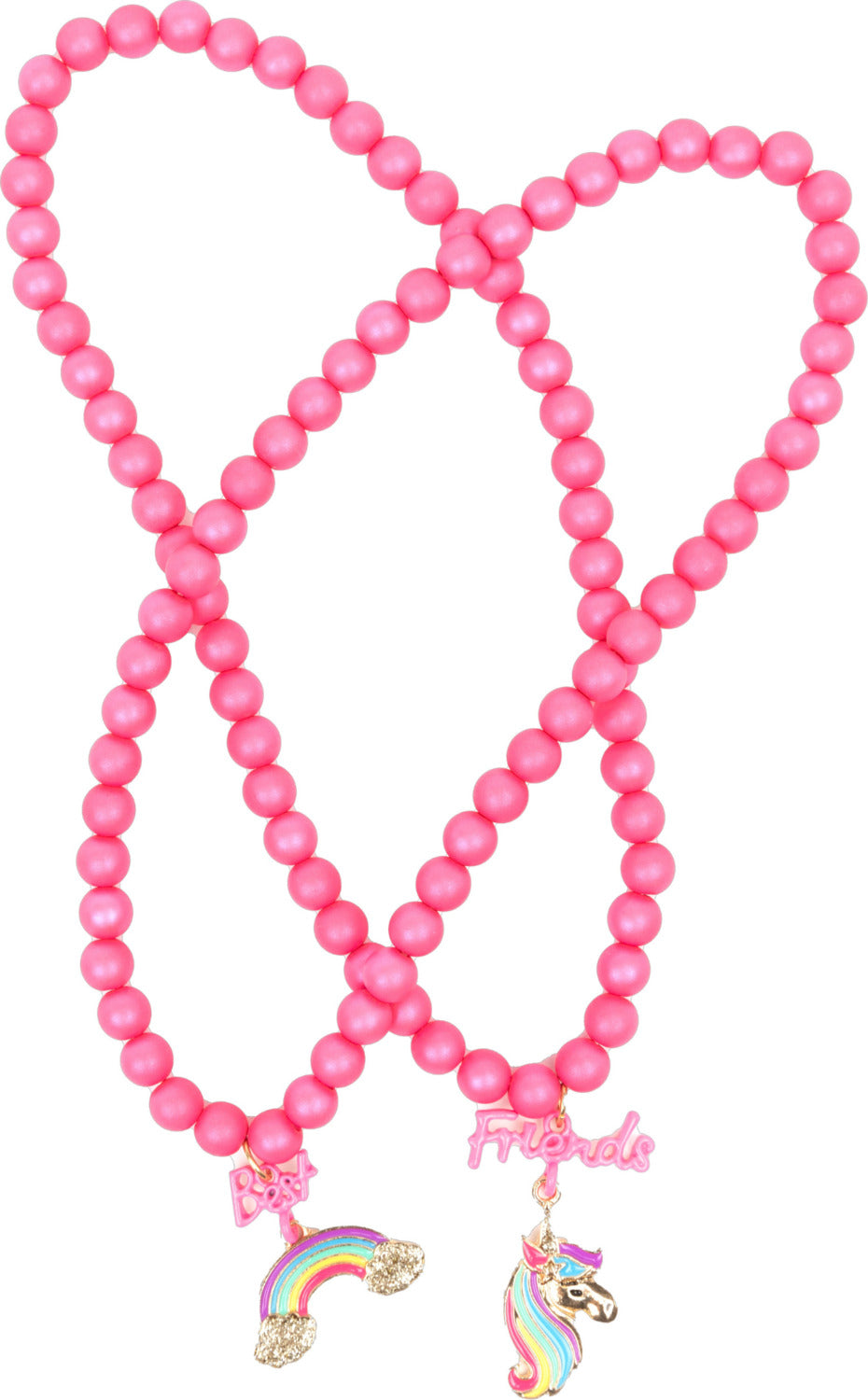 Our Best Friends Rainbow Unicorn necklaces are perfect for wearing and sharing! Featuring bright pink beads and cheerful unicorn and rainbow designs, these necklaces are a fun and fashionable way to celebrate friendship.