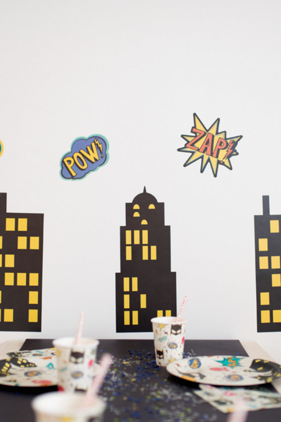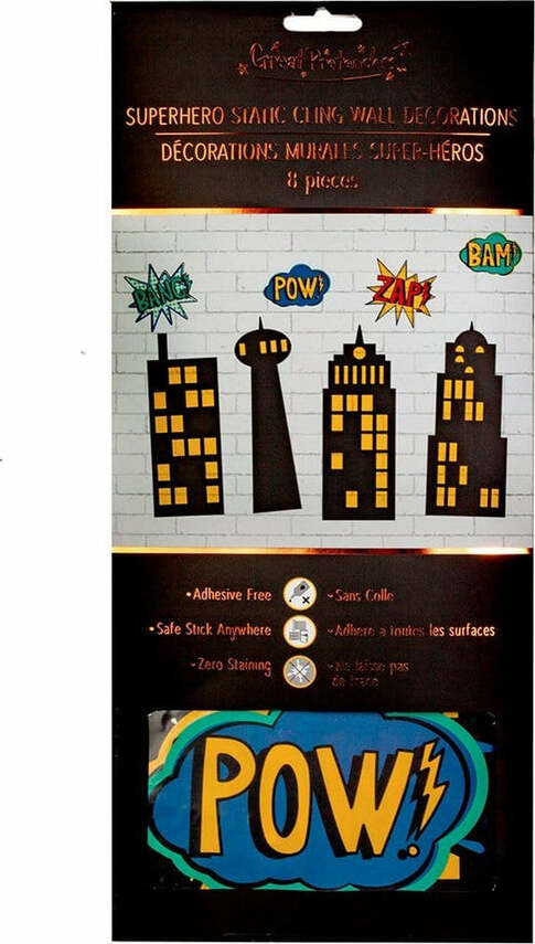 These static cling decorations will stick to almost any surface, without leaving any sticky residue or damage to the surface they're applied to. Shapes include 4 different styles of buildings, as well as 4 comic action bubbles. Simply slide the decoration along the surface of the wal and into place. When done, remove the decoration, store, and reuse.