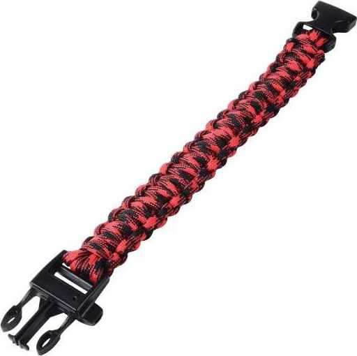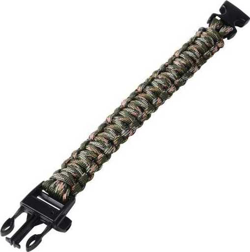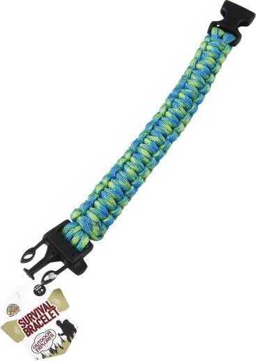 Wear this outdoor companion bracelet and be prepared for emergencies 16 feet of paracord holds up to 200 lbs and built in whistle Made of plastic and paracord material 9.5" L. Display with assorted styles 3+ Bin 36 piece per unit