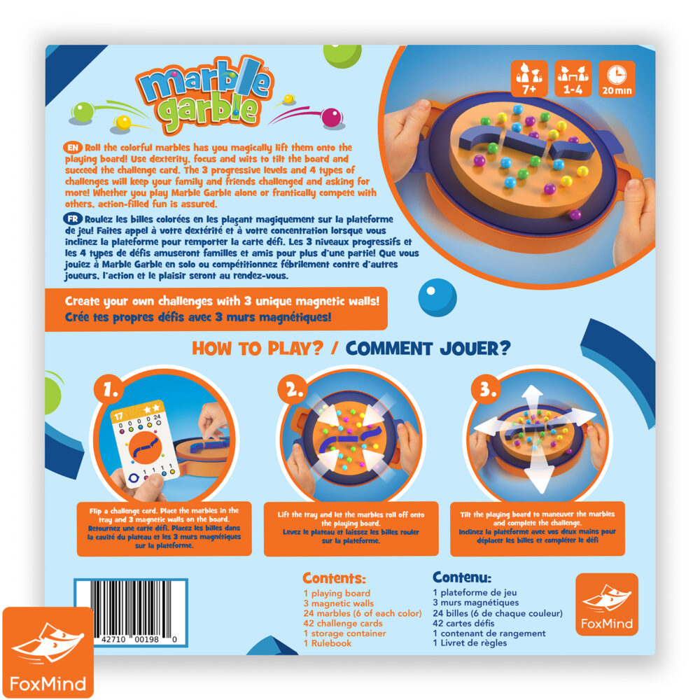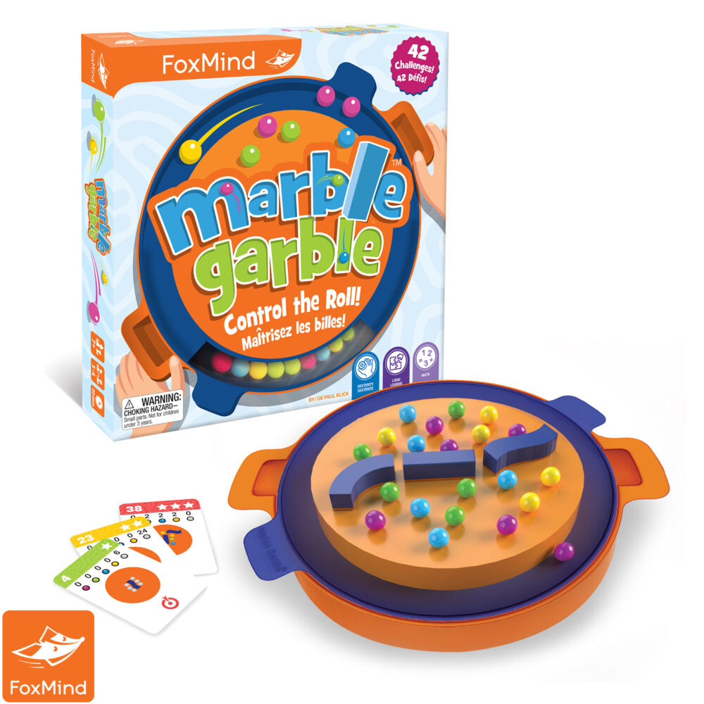 Roll the colorful marbles as you magically lift them onto the playing board! Use dexterity, focus, and wits to tilt the board and succeed the challenge card. The 3 progressive levels and 4 types of challenges will keep your family and friends challenged and asking for more! Whether you play Marble Garble alone or frantically compete with others, action-filled fun is assured.